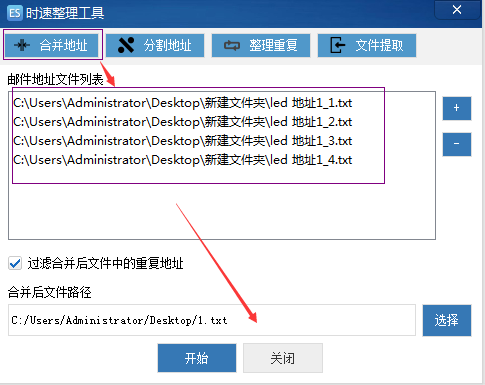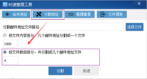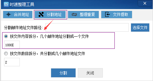 合并后的文件可以再用分割地址工具,将他们分为每1000个(邮件地址数量可自定)地址为一个文件,或平均分割成4个(文件数量可自定)文件