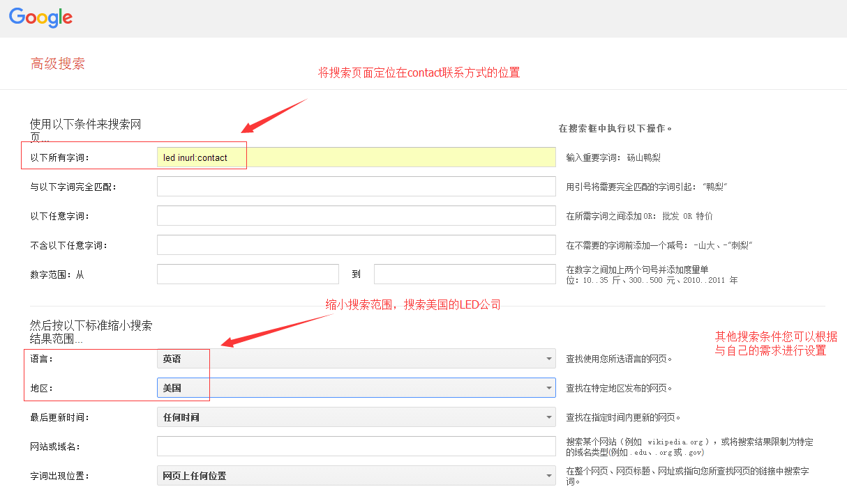 具体应用如下:LED inurl:contact,其中的LED,是您需要搜索客户的主关键词,而contact则是您需要定位到的位置。