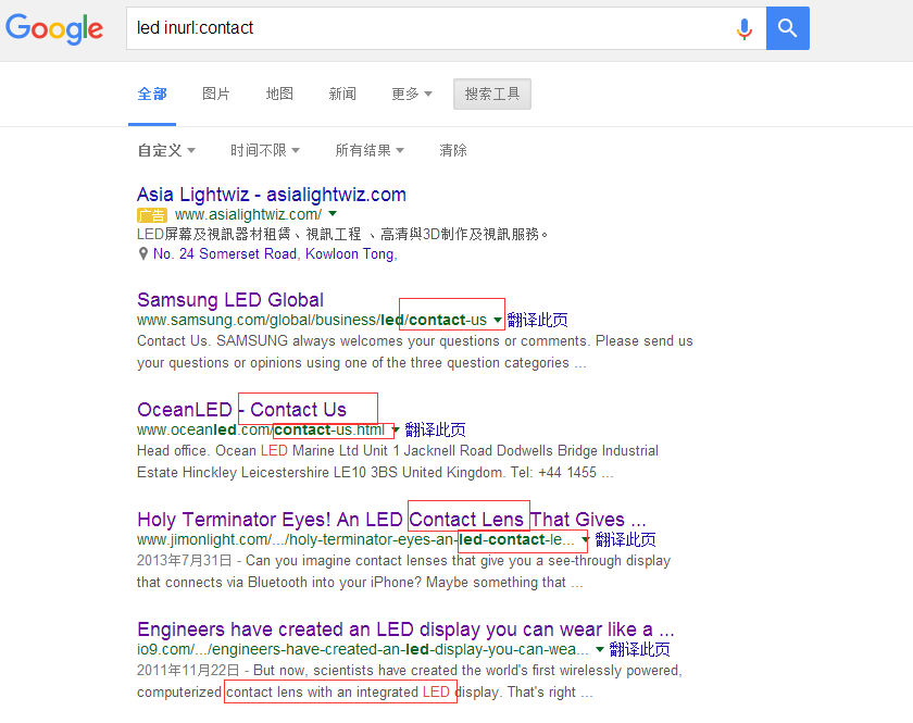 比如您需要找关于美国LED客户网站的联系方式,直接搜索LED,出现的信息是非常杂乱的,在这里,您就可以使用Inurl指令,直接找到LED公司网站中“联系我们”的页面。