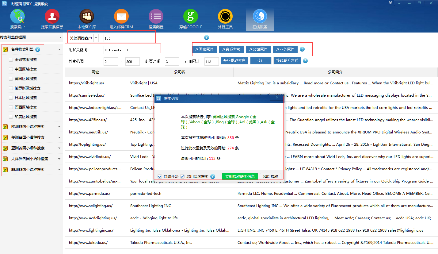 在我们的鹰眼搜索系统里,操作更加简便,只需您输入关键词以及选定搜索引擎后,在附件关键词后面的选项中,选择需要搜索的国家,当地关于联系方式的书写方法,以及公司属性,就可轻松搞定,并且搜出的都是公司的信息!!