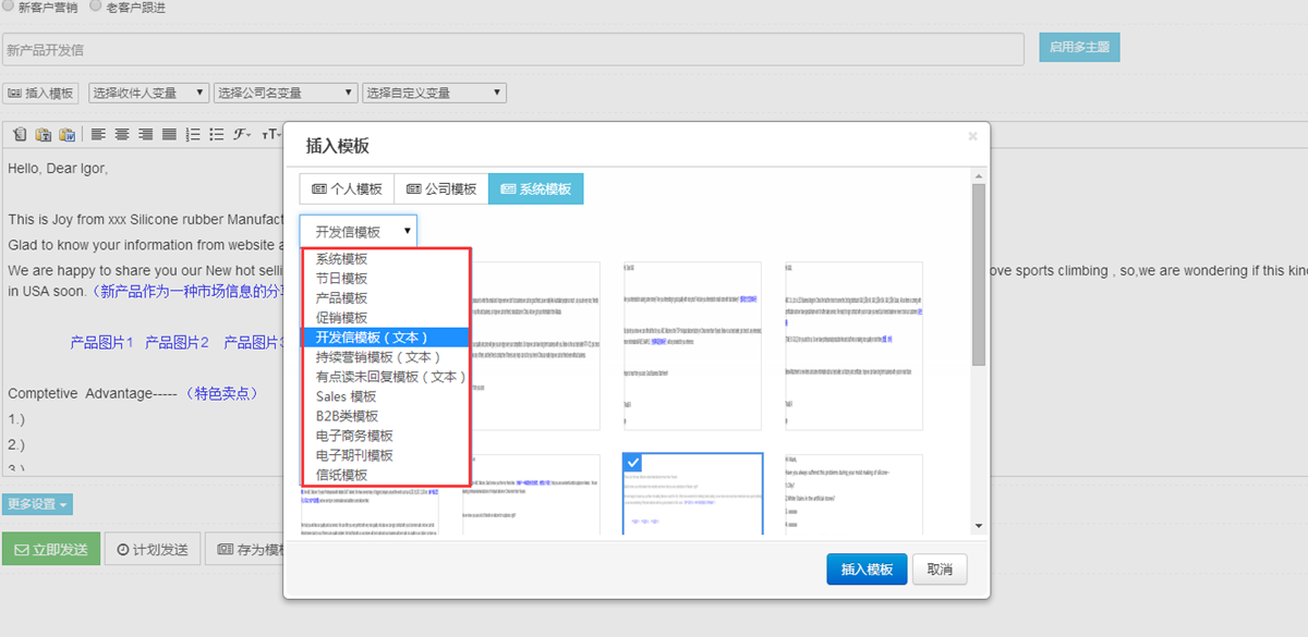 用时速营外贸销邮发开发信就能结合系统模板自制出公司特色模板,分别对新客户和老客户的邮件进行差异化的邮件营销。