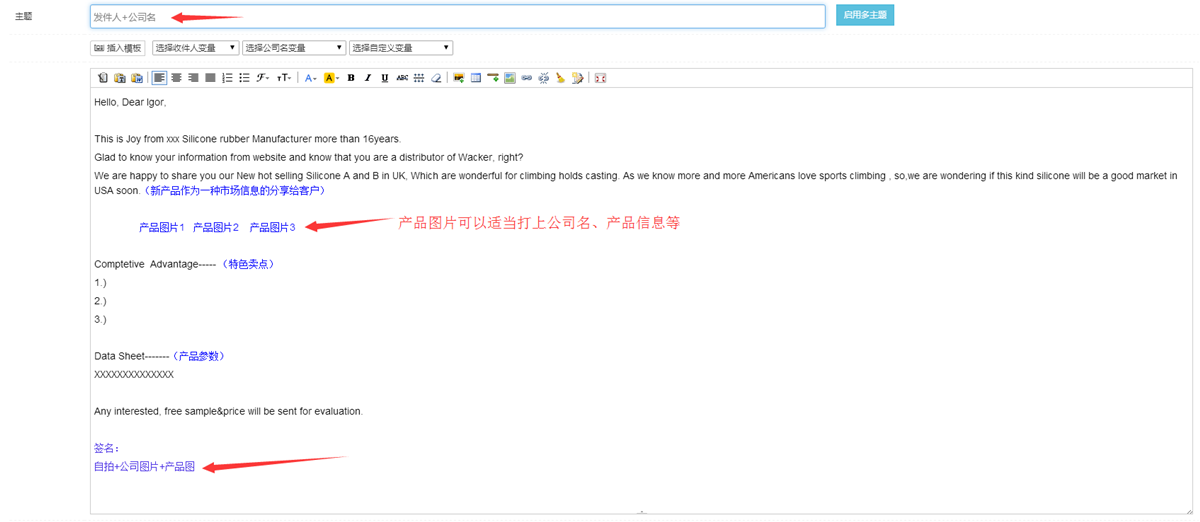当然,开发信中的图片可以打上公司名、产品信息等。