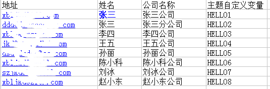 按此模板导入,想要变化姓名或公司名,或每个地址单独一个主题,哪些一项就必须要有内容